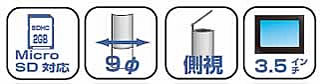 | ■製品の主な特徴 ●基本性能を網羅し低価格を実現 SD カードに静止画・動画を記録、狭い場所での観察にも適しており側視アダプターも標準装備。 収納時はモニターを外して持ち運びも出来るベーシック機能搭載の内視鏡です。 ●4倍までのズーム機能を搭載 撮影中や撮影したあとの画像を本体のモニタ上で4 倍までデジタルズームができるので細かく見たい場所も見ることができます。 ■付属のmaicroSD カードに静止画・動画を記録。 ![]() ■側視アダプターも付属 ![]() ■シリーズ共通仕様 ●先端カメラ径9mm の内視鏡。3.5 インチのポータブルモニターは取り外し可能です。 ●動画・静止画共にSD カードに録画可能。SD カードが付属しています。 ●側視アダプターが標準で付属しています。 ●TV モニターに映し出すことも可能。 ![]() ■共通仕様