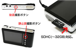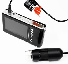 | ■特長 ●従来品と比較して、コントラスト・色合い・鮮鋭度の向上に加えセンサー感度も上がり、暗い被写体に強くなりました。その他、ちらつきが無いスムーズな描画、より自然な色を表現する事も可能になりました。 今まで、パソコンやテレビ、ACアダプターなどに接続しての使用が前提でしたが、この商品は思ったときに好きな場所へ持ち運んで使用出来る、とても便利なマイクロスコープです。さらにSDHCカード(〜32GB)への動画と静止画の撮影機能やテレビ出力機能も備えており、パソコンでの使用時に引けを取りません。 ●頭皮やお肌や基盤などの精密機器まで幅広く拡大する事が可能です。 ![]() @工場などでの検査・検品 A自由研究など B病院、学校での研究や実験 C外出先で ■専用バッテリー/ACアダプター ![]() ■SDHCカードへの動画・静止画の保存 ![]() ■本体詳細 ![]() ■仕様