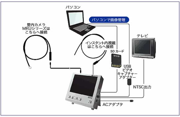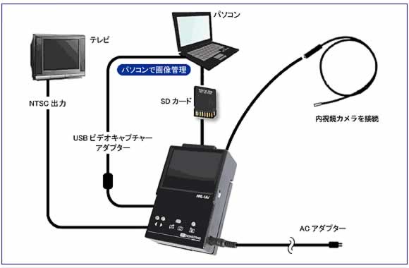 ■主な機能 ●鮮明なモニター モニタサイズは鮮明な3.5インチ(名刺サイズ程度)、5.6インチ(葉書サイズ程度)TFT液晶を採用。 ●LED照明の調光 モニタについている『前の画像』『次の画像』の2つのボタンで、内視鏡カメラの明るさを6段階に調光できます。 ![]() ●場所を選ばない駆動電源 電源はACアダプタ、または市販の乾電池のどちらでも駆動できます。 屋外でも電気設備のない場所でも、場所を選ばずお使いいただけます。 ![]() ●テレビへの接続 NTSC入力端子のあるテレビなら機種を選ばす接続でき、内視鏡カメラからの映像をテレビ画面上に映し出すことができます。大勢で大きな画面で観察する時などに便利です。 ■主な特長 ●ポケットに収まるハンディサイズ 作業着の胸ポケットに収まるコンパクト設計。移動のときに場所をとりません。 ![]() ●SDカードに画像保存 モニタの『保存』ボタンで、内視鏡で映している映像を静止画像としてSDカードに保存できます。 画像の保存形式はJPEG形式。 静止画像の入ったSDカードをパソコンに差し込めば、パソコン上で画像を見られることはもちろん、メールに添付したりなど、様々な用途にお役立ていただけます。 ●NTSC出力 モニタの画像をテレビモニタに映し出すことができます。 また、ビデオデッキに接続すれば、動画の保存も可能です。 ●可変スタンド モニタの角度が自由に変えられます。 スタンドは折りたたんで収納しておけるので、すっきりとしたフォルムです。 ![]() ●ガイド機能 モニタ画面の左上にLED照明の明るさ・撮影枚数・電池残量が表示されます。 ●USBビデオキャプチャーアダプタ内蔵可能(M1129KT-56SASのみ対応) USBビデオキャプチャーアダプタを内蔵すれば、モニタを普段使用しているパソコンに直接つなげることができ、パソコンの画面上にも内視鏡カメラからの映像を映し出すことができます。 また、その映像をそのまま動画として保存することも可能です。 ■接続のしかた
