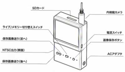 | ■極細細工業用内視鏡 外径:1.8mm(3.5インチモニタ接続タイプ) ファイバーを使わない高画素イメージセンサタイプの工業用内視鏡です。 シンプルな機能で手軽にどこでも使えます。 ポケットサイズの専用モニタには斜め方向からでも画像がはっきり見える視認性の高い3.5インチ液晶モニタを採用しました。 静止画像も撮影でき、SDカードにJPEG形式で保存します。 NTSCビデオ出力端子もついているのでテレビモニタに表示することも可能です。 ■外観図(接続図) ![]() ■内視鏡(直径1.8mm)カメラ