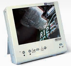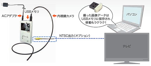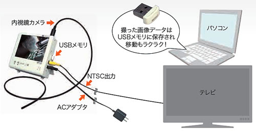 モニタには画像保存機能が標準装備されており、内視鏡をお使いのその場ですぐに画像の保存・確認ができます。画像の保存形式はJPEG形式。USBフラッシュメモリに保存されるので、パソコンでも管理可能。撮った画像は様々な用途にお役立ていただけます。 電源は、屋外や電気設備のない場所でも使えるよう、ACアダプタの他に電池ホルダーも装備しています。 ●鮮明なモニタ モニタサイズは鮮明な3.5インチ(名刺サイズ程度)、5.6インチ(葉書サイズ程度)TFT液晶を採用。 ●LED照明の調光 モニタについている『前の画像』『次の画像』の2つのボタンで、内視鏡カメラの明るさを6段階に調光できます。 ●場所を選ばない駆動電源 電源はACアダプタ、または市販の乾電池のどちらでも駆動できます。屋外でも電気設備のない場所でも、場所を選ばずお使いいただけます。 ●テレビへの接続 NTSC入力端子のあるテレビなら機種を選ばす接続でき、内視鏡カメラからの映像をテレビ画面上に映し出すことができます。大勢で大きな画面で観察する時などに便利です。(3.5インチモニタではオプション機能です。) ●ポケットに収まるハンディーサイズ 作業着の胸ポケットに収まるコンパクト設計。移動のときに場所をとりません。 ●USBフラッシュメモリに画像保存 モニタの『保存』ボタンで、内視鏡で映している映像を静止画像としてUSBフラッシュメモリに保存できます。画像の保存形式はJPEG形式。静止画像の入ったUSBフラッシュメモリをパソコンに差し込めば、パソコン上で画像を見られることはもちろん、メールに添付したりなど、様々な用途にお役立ていただけます。(HKT-3.5S/HKT-5.6共通) <5.6インチモニタ HKT-5.6S について> ●可変スタンド モニタの角度が自由に変えられます。スタンドは折りたたんで収納しておけるので、すっきりとしたフォルムです。 ●ガイド機能 モニタ画面の左上にLED照明の明るさ・撮影枚数・電池残量が表示されます。 ■ USBビデオキャプチャーアダプタ内蔵可能(オプション) USBビデオキャプチャーアダプタを内蔵すれば、モニタを普段使用しているパソコンに直接つなげることができ、パソコンの画面上にも内視鏡カメラからの映像を映し出すことができます。また、その映像をそのまま動画として保存することも可能です。 <3.5インチ液晶モニター:M1129KT-35JS> ![]() <5.6インチ液晶モニター:M1129KT-56S> ![]()
