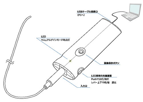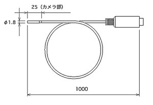 | ■超極細工業用内視鏡 外径:1.8mmファイバーを使わない高画素イメージセンサタイプの工業用内視鏡です。 シンプルな機能で手軽にどこでも使えます。 専用モニタを使わずWindows PCに画像を表示させるUSBインターフェースです。 一般的な画像ソフト(AMCap)を使い静止画・動画の保存が可能です。 USBバスパワーを使い内視鏡を駆動させるので、内視鏡用に電源を用意する必要がありません。 ■外観図 ●内視鏡カメラ部 (単位:mm) ![]() ●USBインターフェース ![]() ■内視鏡(直径1.8mm)カメラ