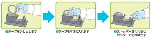 | ■特徴 ●カッターは中空構造なのでゴミが貯まらず清掃が容易です ●底はノンスリップマットを使用しているので防滑性にすぐれています ●床に落下しても割れたりする事もなく、テープリールを使用していませんので、部品の紛失もなく、取り付けも簡単。 ![]() ■テープの取り付け方 ![]() ■寸法図 ![]() ■仕様