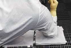 | ■特長 マットは導電性スポンジを使用することにより強い弾力が得られ長期間の使用でも耐えられます。 ●本体 スポンジ表面に被膜加工する事で、撥水・吸水性がほとんど無く、従来のスポンジの様に型崩れをおこしにくく、ちぎ れ等により塵を発生することがないので、クリーンルームに最適です。 ●カバー(付属しています) クリーンウェアの生地と同じ静電性フィラメントを使用。微細ゴミが出ません。 ![]() ■用途 装置のメンテナンス、組立・配線工事時にひじ、ひざ、尻等の負担を和らげます。 ![]() ■重ねて収納できるので場所をとりません。 ![]() ■テイピースナッパーが付いているので、用途に合わせ様々な大きさで使用可能 ![]() ![]() ■仕様