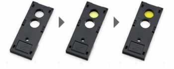 | ■特長 ●持ち運び便利なモニター本体と、脱着可能な小型ホルムセンサ(43×17×4mm)の構成。 ●測定に吸引が不要なため、ホルムセンサ単体だけで測定することが可能。 ●モニター本体に装着した状態で、動態の連続モニタリングが可能。 ●ホルムセンサは、繰り返し使用することが可能。 ■着脱可能な小型ホルムセンサ ![]() ■測定原理 ホルムセンサは、ホルムアルデヒドガスと接触するとルチジン誘導体が生成されて黄色に着色します。 ルチジン誘導体の濃度は、ホルムアルデヒドガスの濃度と暴露時間の積に比例します。 吸光度の変化を測定し(アセチルアセトン吸光光度法)、暴露時間との関係でホルムアルデヒドの濃度が算出できます。 *NTT環境エネルギー研究所の技術を使用しています。