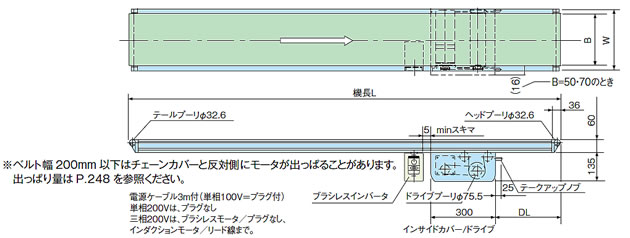 | ●インサイドカバー強力タイプ。 ●メンテナンス性に優れたドライブは、メーカー独自の特許構造。 ●フレーム側面からチェーンカバーの出っぱりなし。(ベルト幅100mm以上) ●フレームの厚み60mm ●最大搬送物質量50kg/全長(標準出力・標準速度のときの目安) ※ベルト幅200mm以下はチェーンカバーと反対側にモータが出っ張ることがあります。 ※スタンド(脚)はオプションです。 ![]() ■特長 ●ブラシレスモータ搭載 環境に配慮した高効率・省エネルギーのブラシレスモータを標準搭載したコンベヤを示します。従来型インダクションモータに比べ、電力を約25%削減。変速比は1:100。 ●バイオマスプラスチック採用 樹脂部品に有機性資源を混合したバイオマスプラスチックを採用しているコンベヤを示します。当社従来品に比べ製品製造時に発生するCO2を約20%削減。 ■標準出力表 下表は20kg/全長、15m/min時(21m/min以上は変速130W・定速90W)