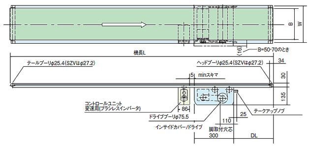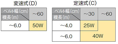 | ●メンテナンス性に優れたドライブは、メーカー独自の特許構造。 ●フレーム側面からチェーンカバーの出っぱりなし。(ベルト幅100mm以上) ●フレームの厚み30mm ●最大搬送物質量30kg/全長(標準出力・標準速度のときの目安) ※スタンド(脚)はオプションです。 ![]() ■特長 ●ブラシレスモータ搭載 環境に配慮した高効率・省エネルギーのブラシレスモータを標準搭載したコンベヤを示します。従来型インダクションモータに比べ、電力を約25%削減。変速比は1:100。 ●バイオマスプラスチック採用 樹脂部品に有機性資源を混合したバイオマスプラスチックを採用しているコンベヤを示します。当社従来品に比べ製品製造時に発生するCO2を約20%削減。 ■標準出力表 下表は10kg/全長、15m/min時(30m/min異常は変速130W・定速90W) ![]() ■寸法図 ●電源ケーブル3m付き(単相100V = プラグ付)、単相200Vはプラグなし ●三相200Vはプラシレスレスモータ/プラグなし、インダクションモータ/リード線まで。 ※ベルト幅200mm以下はチェーンカバーと反対側にモータが出っ張ることがあります。 ![]() ![]() ■サイズ・仕様選択一覧 上記品番記号例を参考に、ご希望の用途に合ったサイズ・仕様を下記から選択して品番を作成し、メールかFAXでお問い合わせください。 ![]()