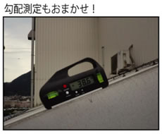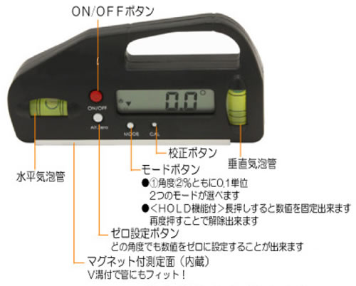 | ■特長 ●見やすいデジタル表示! ●ポケットに入るコンパクト設計! ●測定面マグネット&V溝付! ●手順カンタン!自己校正機能付! ●水平・垂直気泡管付! ●モード 0.1゜単位(角度)→% ●オートOFF機能3分間 ![]() ![]() ![]() ![]() ■校正手順 ◎デジタルユニットの校正機能により場所を選ばず1〜2分で校正が可能です。 ※校正には凹凸の無いある程度の平面と垂直面が必要です。 @ CALボタンを針金等で押し、点滅している状態で本体を凹凸のない平面に置いてください。 ![]() A A.MODEボタンを押して、点滅している状態になるまで本体を動かさないで下さい。 デジタルが、「10、9、8・・・1」と10カウントします。そのあとに「CAL2」と表示されます。 B.製品を180゜振替えてからMODEボタンを押します。 10カウント後、「CAL3」と表示されます。 C.本体を垂直面に合わせ、MODEボタンを押します。 10カウント後、「CAL4」と表示されます。 D.製品を180゜振替えてからMODEボタンを押し、10カウントします。 E.角度表示になれば校正完了です。 ![]() ※校正の10カウントの間は本体を動かさないようにご注意下さい。正確な校正が出来ません。 ■製品仕様 ![]() ■ご注意 ※測定には必ず指定された測定面を測定物に当ててご使用下さい。 水平機の他の面では正確な測定は出来ません。 また測定面に異物が付着している場合でも正確な測定が出来ませんので必ずご使用前に測定面を確認して下さい。 ※デジタル表示と気泡管の測定結果に差異が生じる場合があります。 その場合は、デジタル表示校正手順に従い精度の校正を行ってください。 また気泡管は水平器を左右に振替えながら目盛線の中央に気泡が位置するように求芯してご確認下さい。 ※水濡れの状態や長時間直射日光の当たる場所での保管、放置は故障の原因となりますのでご注意下さい。 気泡管の液色は紫外線の影響で退色することがありますが、精度・感度への影響はありません。 ※付属電池はモニター用の為、寿命が短い場合があります。 ※水平器のご使用前の精度の確認及び測定作業は施工者の技術責任において行われるものであり 工事不良にかかわる一切の責務には応じられません。 |