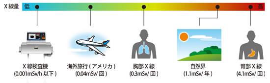 ●洗剤 オゾン殺菌、アルカリ性、酸性洗剤、塩水等を使用する場合はご相談ください。 ![]() ●清掃用具について ![]() ■比較例 X線被ばく量 異物検査には主に、エネルギーの小さなX線を使っています。 ![]() ■ノレンレスタイプ(オプション) ●X線遮へいカーテン(ノレン)がありません。 ●ノレンを通らない軽い商品や小さい商品、無包装品などが流せます。 ![]() ![]() ■図面 ![]() ■仕様