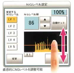 | ■作業者の立場に立った操作性 タッチパネル式検査画面(15インチ) ![]() ■直感的にNGレベルを調整可能 ![]() ■マスク、欠品検査機能