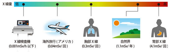 ●洗剤 オゾン殺菌、アルカリ性、酸性洗剤、塩水等を使用する場合はご相談ください。 ![]() ●清掃用具について ![]() ■比較例 X線被ばく量 異物検査には主に、エネルギーの小さなX線を使っています。 ![]() ■図面 ![]() ■仕様