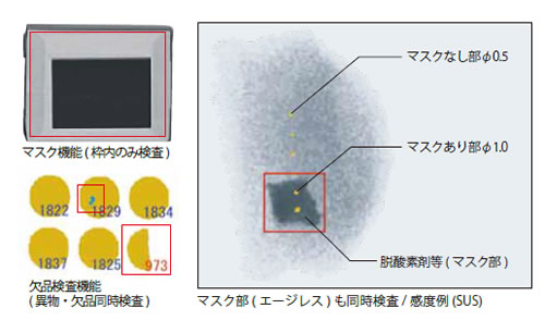 ■特長 ●様々な商品を検査可能 光が透過せず、中身の見えないアルミ包材や缶詰内の異物も検出できます。 ![]() ●X線発生の仕組 スイッチにより、X線を瞬時に発生・停止でき、検査品にX線が残ることはありません。 ![]() ●使いやすい操作性 15インチのタッチパネル式検査画面で、ラクラク操作。 NGレベルも直感的に調整可能。 ![]() ●マスク・欠品検査 検査範囲を指定するマスク機能、商品に欠品が無いか調べる欠品検査も異物検査と同時に可能。 ![]() ●外部メモリー書出機能(オプション) ![]() ●重量チェック機能(オプション) ![]() ![]() ■幅広い異物を検出 密度の高い物質ほど、検出し易くなります。 ![]() ■ネットワーク管理(オプション) LAN接続によって、複数台の機械のデータをパソコンで管理できます。 ![]() ■HACCP対応 HACCP対応のオールステンレス仕様。 防塵・防水規格IP66をクリア(検査室) ●ベルトの簡易脱着 搬送ベルトは簡単に外せ、清掃もラクラク。 ![]()
