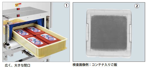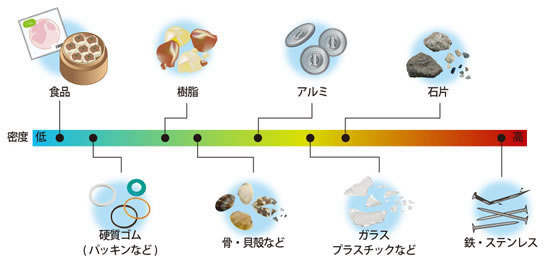 ■特長 ●様々な商品を検査可能 光が透過せず、中身の見えないアルミ包材や缶詰内の異物も検出できます。 ![]() ●X線発生の仕組 スイッチにより、X線を瞬時に発生・停止でき、検査品にX線が残ることはありません。 ![]() ■検査例 検査範囲が広く、大きなケースもそのまま通すことができます。 ![]() ![]() ■幅広い異物を検出 密度の高い物質ほど、検出し易くなります。 ![]() ■ネットワーク管理(オプション) LAN接続によって、複数台の機械のデータをパソコンで管理できます。 ![]() ■HACCP対応 HACCP対応のオールステンレス仕様。 防塵・防水規格IP66をクリア(検査室) ●ベルトの簡易脱着 搬送ベルトは簡単に外せ、清掃もラクラク。 ![]()