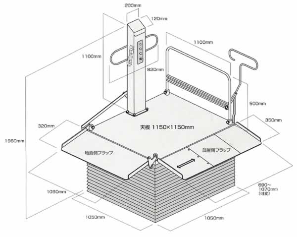 ■寸法図 ●M1204MR-ZHはピット工事が不用なので、据付はいたって簡単。 そして最低高さが70mmと低いので、付属のフラップ(渡り板)で楽に乗り降りできます。 組み立ても付属の「※取扱説明書」を見れば、初めての方でも簡単です。 リフトに出入りする方向も、スイッチ部の右勝手・左勝手・90°リフト上で曲がって出入り・・・と、自由自在に設定でき ます。 ![]() ![]() ※部屋側フラップは、最小幅690mm~最大幅1070mmまで可変 ![]() |