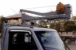 | ■特長 ●軽トラック等の積載物として、附属のワイヤーで荷台に固定。 ●2段折り畳みアーム形式の採用で、広範囲の作業も1人で可能。 ●強力電動ウインチを搭載、上下ボタンを押すだけで作業も安全・スムーズ ●ウインチワイヤーは、直径4mmのステンレスワイヤーなので耐久性は抜群。 ※軽トラックについては、本装置積載走行時には全高2.5M以内となるよう高さを調節して下さい。 ■作業例 ![]() ■走行時はキャビン側へ収納・固定(軽トラ) ![]() ■作業範囲 ![]() ■仕様