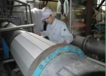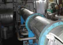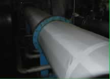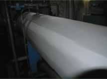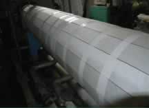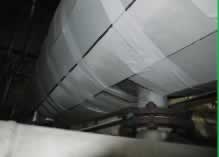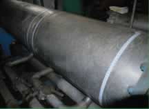 | 1 接着面の処理 ・施工面の油分や水分を取り除いてください。 ・施工面に錆がある場合は、サンドペーパーで錆を落とし、埃や汚れを取り除いてください。 ・耐熱両面テープは、初期接着力が弱い傾向がありますので、少し時間をおいて接着状況をご確認ください。 2 HCの裁断 ・施工面の形状にあわせ、カッター、ハサミ等で加工してください。 (カッターによる切断は、表側(ガラスクロス側)から行ってください。) ・カッターは、刃先が鋭利な状態でご使用下さい。 ・ハサミを御使用される場合は、できるだけ大きいタイプをご使用ください。 3 耐熱両面テープの施工 ・両面テープは、最初に設備側に貼り付けても、HC側に貼り付けても性能に影響はありません。 施工個所に応じてご検討ください。 (障害物の少ない個所は、設備側に施工された方が施工効率は上がると思われます。) ・耐熱両面テープは、仮止めの為に使用しますので、施工個所に応じて、1mに対し2ヶ所~3ヶ所の施工をお願い致します。 4 HCの施工 ・HCを、耐熱両面テープや必要に応じ布テープ等で仮止めしてください。 ・仮止めが完了しましたら、必ず各パネルに対し長手方向の2ヶ所~3ヶ所を、連続した状態で布テープ等で巻き留めを行ってください。 (HCの表面温度が50℃以上になる場合は、耐熱アルミテープで巻き留めして下さい。) 巻き留めは、必ずテープ面への重ね貼りで、長さは1.3周を目処に行って下さい。 ・施工面の形状により、HCがR状になる場合は、ケースに応じて、耐熱アルミテープ等で上から補強してください。 (HCが、層間剥離する場合がございます。) 5 HCのジョイント部 ・HCの断熱効果は、施工面積に比例して効果がでますので、ジョイントに隙間があっても、効果にはあまり影響がございません。 ・HC端面から水や蒸気が侵入する可能性のある場合、シール材や耐熱アルミテープ等で小口を塞いで下さい。 6 表面仕上げ施工 ・大口径配管等(400φ以上)への施工は、表面カバーシートの施工を推奨致します。 断熱性能と意匠性がUPします。また、表面カバーシートの貼り替えや重ね貼りにより容易にリフレッシュが可能です。 表面カバーシートは、4辺を布テープや耐熱アルミテープで固定してください。 ・小口径の配管等へは、布テープや幅広のテーピングテープ等で斜め重ね張りで全面を覆ってください。 ・表面カバーシートを使用されない場合で、小口が露出している場合は、耐熱アルミテープ等で小口を塞いでください。 7 その他 ・HCは、耐熱両面テープ、布テープ、耐熱アルミテープ等の市販材料による簡易施工とセルフメンテナンスを特徴とし た 製品です。 施工部位や状況に応じて、各種テープでの補強・補修方法をご検討ください。 ■M1223C-P11F施工例