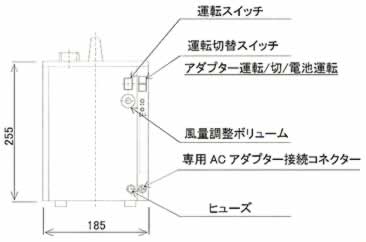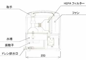 | ■特長 ●HEPAフィルターで濾過した清浄空気と純水のミストによりクリーンルーム内を汚染する事無く気流状態を可視化します。 ●充電池を内蔵し、コードレスにしました。従来の電源コード付と比較して、移動及び取扱いが容易になりました。 ●一回の充電(約150分)で約30分間の連続運転が可能です。 ●軽量化を図りました。(7.5kg⇒6kg)(20%減)(当社比) ●小型化を図りました。(325W⇒250W)(体積化19%減)(当社比) ●ULPAフィルターに交換することによりISOクラス4(クラス10)の気流も見る事ができます。 ![]() ■バイオハザードキャビネット作業室内気流 ![]() ■CR内気流 ![]() ■寸法図 ![]() ![]() ![]() ■仕様