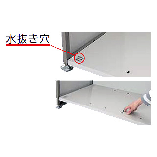 コーナー4ケ所の水抜き穴で排水性を高め、雨水や清掃水がたまりません。