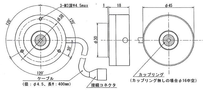 | 小さいボディにカップリング内蔵のデジタル回転角度センサーです。 小型センサーでの最小読取値1分(0.01°)を実現しました。 ■特長 ●外径φ45の小型ボディにカップリング(ユニバーサルジョイント)を内蔵している為、取付が容易で機器取付後のまとまりが良い。 ●液晶表示部も小型で取り付け場所を選びません。 ●カップリングを取り外せばφ16の中空軸になります。 ●0°0´(60進)⇔0.00°(10進)切替機能、プリセットなど機能も充実。 ●電池駆動で電源のない場所でも使用できます。(オプションでACアダプター有り) ●データ出力機能付。 ■センサー部主要寸法 ![]() ■表示部主要寸法 ![]() ■測定方法 内部の円盤状の部品に磁気スケールが貼りつけてあり、その回転角を磁気センサーで読み取る構造となっています。 カップリング付では、円盤状の部品にカップリングが固定された状態となっています。 ■仕様