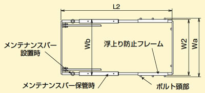 ■寸法図 ![]() ■下部フレーム関連Wa、Wb寸法について 下部フレームに取り付けてある浮上り防止フレームがボルトによる固定のため、ボルトの頭部が下部フレームにより突出している機種があります。また、メンテナンスバーにつきましても、保管時および設定時に下部フレームよりはみ出している機種がありますのでご注意ください。 ![]() ■仕様