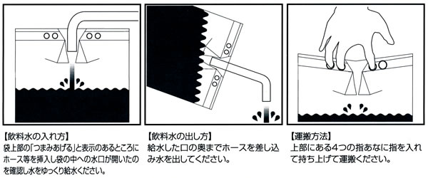 | ■概要 ●災害で水道管のトラブルで断水が起こることがあります。 その際に復旧までの期間に必要な水を蓄えることが出来る! ●通常のホースから給水可能となっておりますので、 いざというときに給水車から飲料水を直接受け取ることも可能! ●素材は、ポリエチレン100%(食品衛生法対応)で安心! ●試験場のテスト結果で水道水を3日間保管しても大丈夫と合格! ■特徴 ●10Lの水を注入し、逆止弁(特許第5499214号)で横倒しでも漏れない保管が可能。 ●厚生省告示第20号適合食品用ポリエチレン使用 ●飲料用水質試験通過(水道水にて暗所保管で最大3日) ■取扱説明 ![]() ■封止方法 給水口の上にある印刷「つまみ上げる」とある部分を「山折状態」にしながら横倒しにしてください。 ![]() ■仕様
