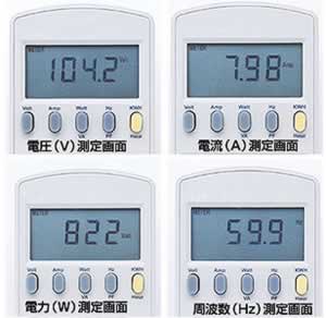 | ■使用方法 前面のコンセントに測定する機器の電源プラグをしっかり差込んで、壁のコンセント等に差込みます。 あとは測定したいボタンを押して数値を読取ります。 ■測定機能 ![]() ■差し込み ![]() ![]() ■仕様