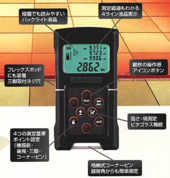 | ■ワンタッチ操作で目標物までの距離をデジタル表示。 バックライト付き液晶・4ライン表示で面積・容積測定の途中経過もわかる。 部屋角や隅からの測定もアイデア満載。 ■特長 ●直線・面積・容積モードにピタゴラス機能(高さ、幅測定)、測定値の加算減算、最小値・最大値が簡単に測定できる。 ●±3mmの精度、ドイツデザイン、コストパフォーマンスの3拍子揃ったレーザー距離計。 ●ピタゴラス機能(高さと幅測定) ●測定値の加算・減算 ●複数の面積・体積の加算減算機能 ●MIN/MAXモード(対角線・水平値測定) ●4ラインディスプレイ(測定の途中経過表示) ●オフセット機能(測定始点の切替<最前面/最背面/三脚ネジ穴/コーナーピン>) ![]() ●自動電源オフ(5分) ●バックライト付液晶ディスプレイ ●コーナーピンで、部屋の角や狭い箇所から測定 ![]() ●三脚(1/4"穴)に取り付けできる ●フレックスポッド(フレキシブル小型三脚)標準セット(M138RMP-30MPRO) ■ピタゴラス機能で高さも自動計算 ![]() ■直線だけでなく、面積・容積もシンプル測定 ![]() ■タイプ