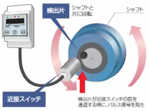 | ■特長 ●調整不要でカンタン導入 機械装置の正常な回転数を自動で記憶する為、面倒な調整が不要です。 ●安全に異常をキャッチ 変換器側で設定する為、現場に行く必要がなく安全に監視できます。 ●メンテナンスフリー 無接触で検出するので、摩擦などの心配は不要です。 ■動作原理 機械装置の回転軸に取り付けられた磁性体の検出片が、回転軸と共に回転することで、近接スイッチがパルス信号を検出します。 そのパルス信号の周期が回転軸の回転速度に応じて変化し、記憶された値から降下すると、リレー接点が出力されます。 ![]() ■アプリケーション事例