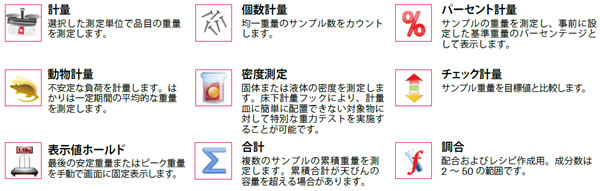 重量・%・個数・チェック・動物計量・合計・調合・表示値ホールド・密度測定 |