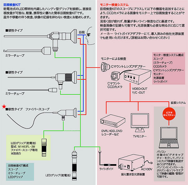 | ■目視検査システム/TVモニター検査システム ※M1463HD-A085500Mのシステム構成は★印 ![]() ■φ0.85mm ![]() ■主な用途 ●自動車、航空機などのエンジン及び部品内部の検査 ●金型、切削加工品のバリ検査 ●タービンブレードの検査 ●小口径パイプの検査 ●鋳造品の「す」や形状欠陥検査 ●構造物内部検査、コンクリート剥離診断 ■仕様