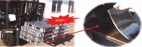 ■使用上の注意 ●安全を保障する商品ではございませんので、装着時でも荷扱いには十分お気をつけください。 ●フォークリフトの爪の厚みに比べて、パレットの挿入部の高さが十分にあることを確認してご使用ください。 ●積載物を滑らせるような荷扱いには不向きですので、ご使用は避けてください。 ●-20℃以下、70℃以上の環境下では、硬化・軟化の恐れがありますのでご使用は避けてください。 ●保管は屋内にてお願い致します。 ●フォークリフトの爪に錆びや汚れが付着した場合は、湿った雑巾等でしっかり拭き取ってからご使用ください。 |