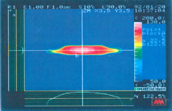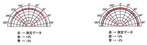 ■風速検出センサー 専用に設計した白金薄膜センサーは、安定性応答性・強度耐久性に優れ 測定流体との間で安定した熱伝達が行われます。 センサーは表面が均一に発熱するようにレザートリミングを行い、ガラスコーティングを施してあります。 ![]() センサー熱分布 ■キールプローブの指向性特性 流れの方向に対して傾いたキールプローブ内部の流れは水平方向及び垂直方向とも約±50°の偏角までキールプローブの軸に対して一定に保たれた流線がセンサーに与えられるのでベクトル補正を行わなくても±2%の測定精度を維持できます。