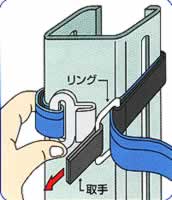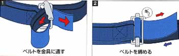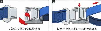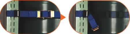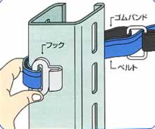 | ■特長 ●棚に収められた商品・書籍・収集資料等の地震による落下を防止するベルトです。 ●取り付けは簡単ワンタッチ。様々な支柱に取り付けたまま、高さ調節が自由自在にできます。 ●収納品の取り出しも簡単ワンタッチ。開閉バックルは軽荷重から重荷重まで、用途に応じて5種類あります。 ●ベルト幅は25mm、50mmの2種類で、材質はポリプロピレンとナイロン、重荷重用にポリエステルもあります。 ■開放時にもベルトの位置が変わらないので開閉作業が簡単です。 ![]() ■使用例