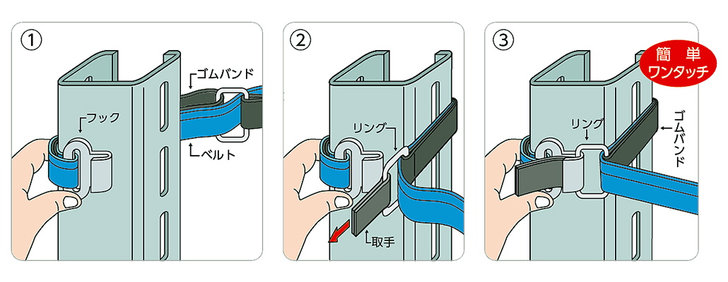 棚の支柱にベルトを巻き付けるように取り付けるループベルトタイプ。テンションゴムで保持しますので、ズリ落ちることなく自由な高さに取り付けできます。