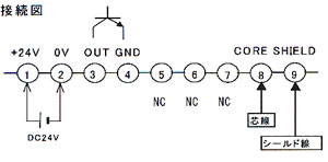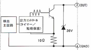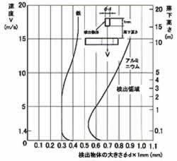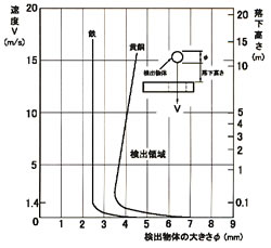 注:センサー入力・シールド(⑨番)、無接点出力GND(④番)、電源端子0V(②番)、は内部でつながっています。 ![]() ![]() 注:1.負荷は下図のように接続下さい。 ![]() 2.負荷の容量は、DC30V 50mA Max.です。 ■検出物体の大きさと通過速度