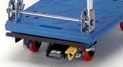 ■オプション 安全性と機能性を使い易く操作性にすぐれています。 足先でONペダル(黒)を踏むと、後輪の固定車2輪が同時にロックします。 OFFペダル(黄)を踏むとロックは解除します。 ・ブレーキ調節機能付き。 ・後からでも取付け出来ます。 ・平台車には取付けできません。 ![]() ■仕様 (mm)