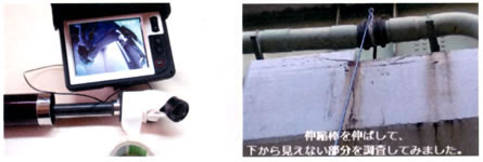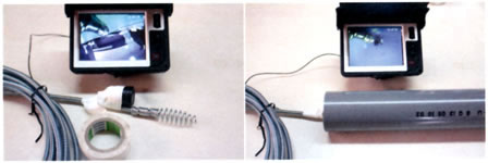 | ■特長 ●録画できるので、クライアントに動画でプレゼン&作業報告!撮った写真を報告書に使えば信用度UP! 画像は本体内蔵の専用メモリーに記録されますので付属のPC接続ケーブルをPCにつないでいただきまして、画像をPCにダウンロードしてください。 ●配管内洗浄を見ながらする。 高圧洗浄機ノズルの少し手前に絶縁テープでカメラ部分を固定。 ![]() ●配管内の詰まりを見ながら取る! パイプクリーナの先に絶縁テープで固定。50mm以上の配管内を見ながら目ずまり除去作業が出来る! ![]() ●曲った配管内を調査! 市販の丸い発泡スチロールを加工してカメラ部分を中に入れ込み浮力をつける。 曲がった配管等の上部より、水と一緒にカメラを流し込むと曲がった配管内でも調査が可能。流しきった後、回収時に録画をして配管内を調査する。 65mm以上の配管に対応。 ![]() ●屋根裏、床下等を簡単に調査! 適当な伸縮棒(竿)にカメラ部分を絶縁テープ等で固定して、真っ暗な屋根裏や床下の調査ができる。 強力赤外線ライトが付いているので、懐中電灯など用意しなくても簡単に調査できる。 ![]() ●橋げたの亀裂調査に最適! 上記と同様に伸縮棒等に絶縁テープでカメラを固定して、橋げたの亀裂調査等にも利用が可能! ![]() ●もちろん水中調査用に! 伸縮棒などに絶縁テープでカメラを固定し、水中の調査に使う。 水中内の建造物や水の吸い込み口の目詰まり調査に最適です。 ![]() ●その他、井戸の調査に使える! コードは40kg以上の張力があります。 適度のオモリをカメラ下にぶら下げ、井戸内に落とし込む。視野角が135度と広く、強力赤外線ライトが付いているので、簡単に井戸内を調査が出来ます。 ![]() ■仕様