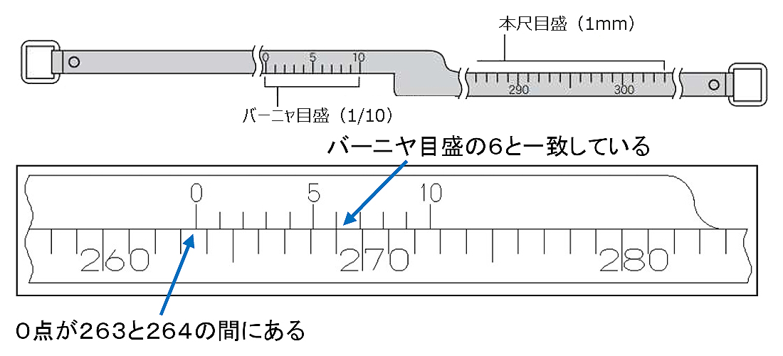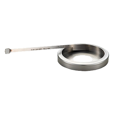| ■特長 ●真円度を有する円筒型の被測定物の外周に巻き付けて、目盛を読むだけでその直径を測定できる製品です。 ●トレーサビリティ関係書類および校正証明書の発行が可能です。(有償) ■バーニャ目盛の使用方法 ![]() 上図の場合 (1)0点が本尺目盛の263mmと264mmの間にあります。 (2)バーニヤ目盛と本尺目盛が一致するところを読み取ると、バーニヤ目盛の6が一致していますので、直径263.6mmとなります。 ※本製品はテープ厚み補正済みですので、読み取り値がそのまま直径数値になります。 ※本製品は20℃にて正確な測定値が得られるように設計されています。本製品の材質(ステンレス)以外の材質の被測定物を精度よく測定したい場合は、できるだけ20℃に近い温度で測定することをお勧めします。 ■共通仕様