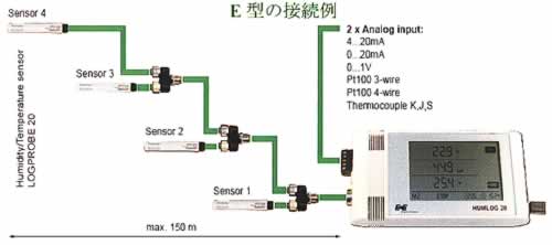 ■主な用途 ●倉庫・工場 ●クリーンルーム ●ビニールハウス ●会議室・ミュージアム・教室等 ■データ収集ソフト 付属の専用ソフトで記録設定、データ収集、グラフ表示、そして印刷などが簡単に行えます。 ![]() ■E型の接続例 ![]() ■仕様