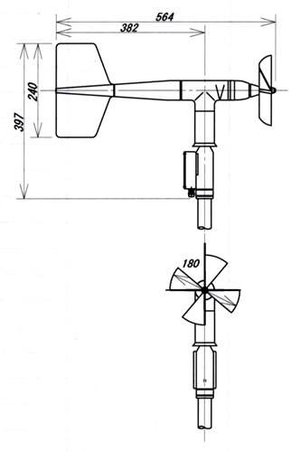 | ■概要 本器は、プロペラ式の風向風速センサーです。 本体はもともと海洋データブイ用として開発された製品で本体の大部分をABSやポリプロピレンなどの樹脂で 制作されており、腐蝕や侵食に強く、非常に軽量です。 そのため、取り扱いやすく、設置が簡単です。 取り付けは、34φmmのパイプに差し込み、バンドを締め付けるだけです。 風速検出はコイルと磁石による非接触発信式、風向検出はポテンショメータ方式です。 そのため、使用するロガーによっては、外部電源を必要としません。 ■外形寸法 ![]() ■仕様