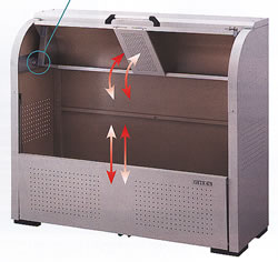 | ■特長 ●高耐久のカラーガルバリウム鋼板を使用。 ●回転扉にはロータリーダンパーを標準装備(左右1個ずつ) ●施工が簡単です。 ●内側からレベル調整が可能。 ●取手の高さは地面より750mmです。 ■スペースを有効活用する扉 上部の扉は簡単に開閉操作できる回転動作式扉。 回転式なので本体内部に扉が納まり、上部分のスペースを有効活用できます。 前扉は前面にスペースが少なくても開閉できるオリジナル機構の上下スライド式扉。 ![]() ■安全性を考慮したダンパー採用 上扉を閉める際に手を放しても扉がゆっくりと閉まるので、指などをはさむ危険性を減らします。 ![]() ![]() ■ゴミが隅に溜まりにくい 塵溜り防止板によりゴミが隅に溜まりにくい構造です。 ![]() ■お掃除簡単 底板は取り外しが可能です。底板を取り外して底板や地面の掃除が簡単にできます。 ※左側の底板を取り外した状態 ![]() ■南京錠取り付け可能 仮ロック機能付きの掛け金で、市販の南京錠の取付けができます。 指定日以外のゴミ捨てや、いたずら防止に効果的。(南京錠は付属していません) ※南京錠つる径φ7.5以下 ![]() ■寸法/奥行 ![]() ■仕様