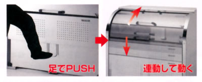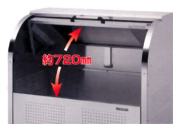 | ■特長 ●サビに強いSUS304製。 ●回転扉・前扉に連動用ワイヤーを取付けることで、開閉時に2つの扉が連動して動きます。 ●従来の手による操作の他に足で開くこともできます。 ●取手の高さは地面より760mmです。 ■ポイント ●1アクションで大開口を実現 手で開けた場合でも、足で開けた場合でも、1アクションで回転扉・前扉が同時に開き、 約720mmの大開口を実現します。 ![]() ●踏むだけで2つの扉が開く フットバーを踏むだけで、回転扉と前扉が連動して開きます。 両手がふさがっていても簡単にゴミ捨てができます。 ![]() ●ワイヤー式連動仕様 回転扉・前扉に連動用ワイヤーを取付けることで、開閉時に2つの扉が連動して動きます。 ![]() ■使いやすさを考えた構造 ●回転扉にはダンパーを標準装備。 ●床板の取外しが可能。 ●ゴミが隅に溜りにくい構造。 ●市販の南京錠の取り付け可能。(南京錠つる径φ7.5以下。) ●内側からレベル調整が可能。 ■タイプ