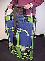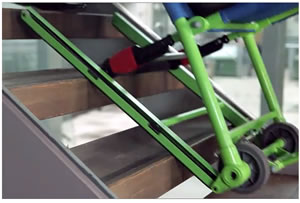 ■操作のポイント ●折り畳まれた避難用階段台車チェアーを広げる。 →簡単に組み立てが可能。「いざという時に、使用できる」大切な要素。 ●駐車ブレーキ装備。(安全に使用するために) →利用者を(車いすから)エクセルチエアーに移乗させる時は、ブレーキを掛けておく。 →万が一、操作者(介助者)が避難用階段台車チェアーから一時的でも離れなくてはならない場合、ブレーキを掛け、駐車できる。 ●スムーズな操作性。 →平坦な場所では、絶えず4輪走行ができ、階段以外の平坦なフロアや狭い路地・踊り場でもスムーズに操作が可能。 ●利用者に優しい配慮。 →アームレスト・フットレストの装備、テンションの張ったフラットシートは、安定・安心した「お座り」を促し、乗り心地のよい使用を可能にする。特に、身体障害者の場合、椅子へのトランスファー(乗せ降ろし)が簡単になる。 ●高い耐久性。 →剛生の高いフレームは、耐久性に優れ、「いざという時の繰り返し使用」を可能にする。 ![]() ■使用 ●操作者の側方に立ち、ハンドルの中心を片手で持ち、サポートする。 ●避難用階段台車チェアーを傾け前輪を淳かし、踊り場から、階段に押し出す。 →この際、避難用階段台車チェアーを傾けすぎないこと。 ![]() ■重要ポイント 避難用階段台車チェアーを傾けすぎると、階段の滑り止めにラバートラックが引っ掛かり、スムーズな操作を妨げる(写真@)。傾きが少ないほど、後輪が滑り止めを乗り越え易くなる(写真A)。 ●サポートしている片手で「ハンドルを押し、下降させる。下降させるための「正しい押す方向」をハンドル操作で、体験者が確認できる。 ![]() ●避難用階段台車チェアーの折り畳み。 ●簡単に折り畳みができ、コンパクトに収納が可能。(広い保管場所を必要としない。) ●製品保障期間は、1年。唯一の消耗品であるラバー・トラックの保障期間は、5年間。 ●購入後の維持費用が掛からない。 ●容易なメンテナンス。原則、メンテナンス・フリー製品であるが、部品交換は容易に行なえ、販売店のメリットは大きい。 ■納品後の点検及び、製品説明に関して 納品後の点検及び、防災訓練などで改めて製品説明などの依頼は、有料にて実施する。 当社の場合は、「正しく製品を理解していただくため」製品の点検十製品説明とあわせて実施する。(別途費用) |
