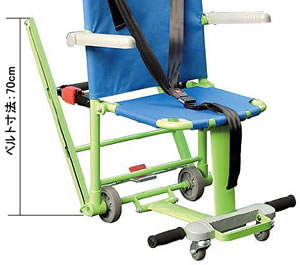 | ■特長 身体に障害を持つなど、自力歩行が難しい方々が、地震・火災などの災害時に、エレベーターが使用できなくなった場合でも、階段を使用して安全に避難が可能です。 平坦なフロアでは、4輪走行となり、スムーズな旋回もでき、狭い踊り場でも、楽に操作が可能です。 老人介護施設、病院、集合住宅など、様々な場面で使用が可能です。 フラットな「座面・背もたれ」にアームレスト・フットレストが標準装備され、安定・安心してお使い頂けます。 ![]() ■仕様