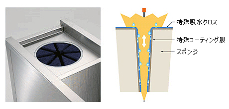 ■吸水クロスマットで吸い取られた雨水は、逆戻りすることなく内部のコーティング膜に沿って落下します。