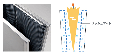 ■メッシュマットではらわれた雨水は、マットやボディ内部に沿って落下し排出されます。