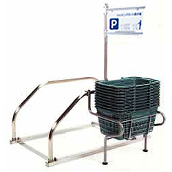 カート収納庫に横付け設置。カート使用時並びに収納時に買い物カゴ置き台がカートの横にあって便利+省スペースにストックできます。