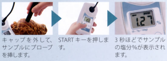 | ■簡単測定 ●固体でも挿して測れるプローブモデル サンプルにプローブを直接挿して、約3秒で測定できます。 「塩の染み込み具合」「塩の抜け具合」「塩の入れ忘れ」などのチェックに。 ■豊富なサンプル例 ![]() ■測定方法 ![]() ■プローブ寸法図 ![]() ■仕様