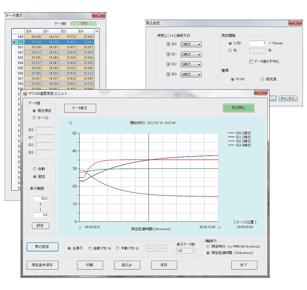 | USBを使用した白金温度センサ用データ取込システムです。 熱電対センサと手持ちのパソコンにUSBケーブルでつなぐだけで測定値の取得、記録などができます。 付属のソフトでグラフ化等の処理と表示が出来ます。 ![]() ■特長 ●USBで簡単接続 M185USB-S01PT2ZTにセンサと手持ちのパソコンをUSBケーブルでつなぐだけで直ぐに測定開始。 記録はパソコン内の超安価なメモリを使用、大量のデータを記録できます。 ●入力回路絶縁 センサをつなぐ入力部とパソコン側内部回路とは電気的に完全に絶縁してあり各種センサを安心して接続できます。 ●Pt100センサ対応(別売り) ハードとソフトウェアを組み合わせた新方式で、2、3、4線式のいずれにも対応、最適の条件で測ります。 ●USBで簡単給電 電源はUSBで給電するため、別途電源は不要で取扱いが非常に簡単です ●付属のアプリケーションソフトを使い、データの表示と保存は楽々簡単、容易に目的を達成できます。 ●全数出荷時、試験済み安心してお使い頂けます。 ![]() ■仕様