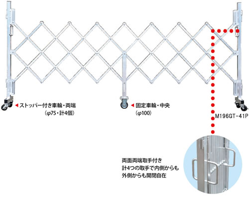 | ■特長 ●戸建て現場や資材置き場などの出入口に ●連結することで広いスペースにも対応できます(連結ピン2本標準装備) ●M196GT-3147P・M196GT-3165Pにはワイヤーガイドが標準装備。ゲートの波打ちを防止します ![]() ![]() ![]() ■用途 ![]() ■収納状態 ![]() ■仕様